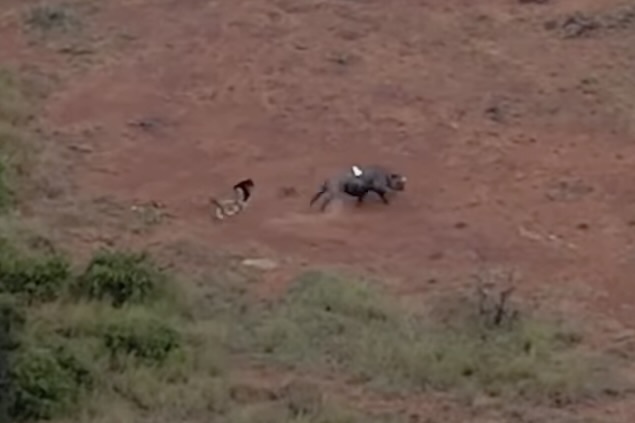Wildlife officials relocated a critically endangered black rhino, but they didn’t expect a male lion to immediately try to take it down.